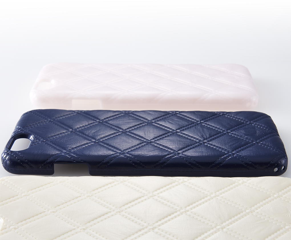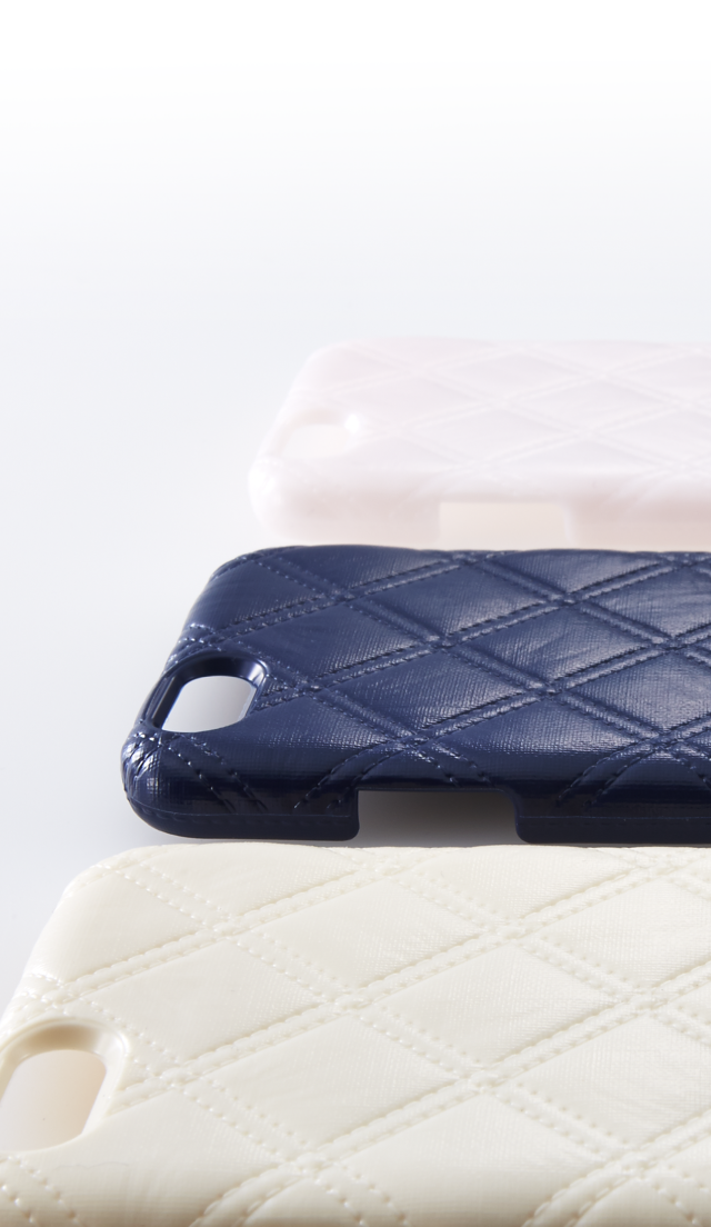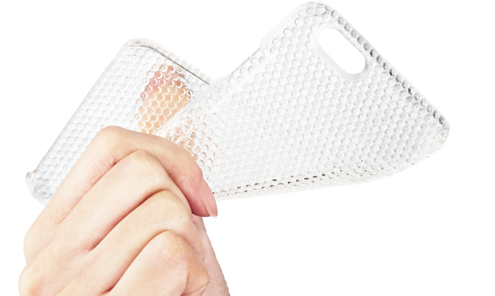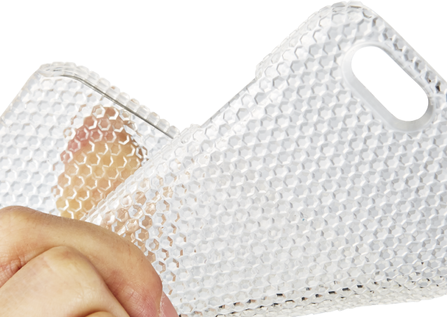 高い強靱さと耐摩耗性をもつ新素材を採用しています。弾力性・柔軟性にも優れており、非常に割れにくいという特性があります。保護範囲を多く取るために液晶画面のギリギリまで覆うケースでありながら、容易な着脱とハードケースで起こりやすい着脱時の割れを防いでいます。